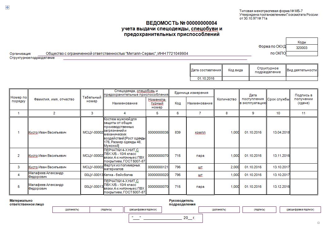 После заполнения документа с легкостью можно распечатать «Ведомость учета выдачи спецодежды МБ-7», номер и дата которой будут отражаться в электронной личной карточке выдачи СИЗ, в графе «подпись получившего», сотруднику остается только расписаться в ведомости учета спецодежды.
