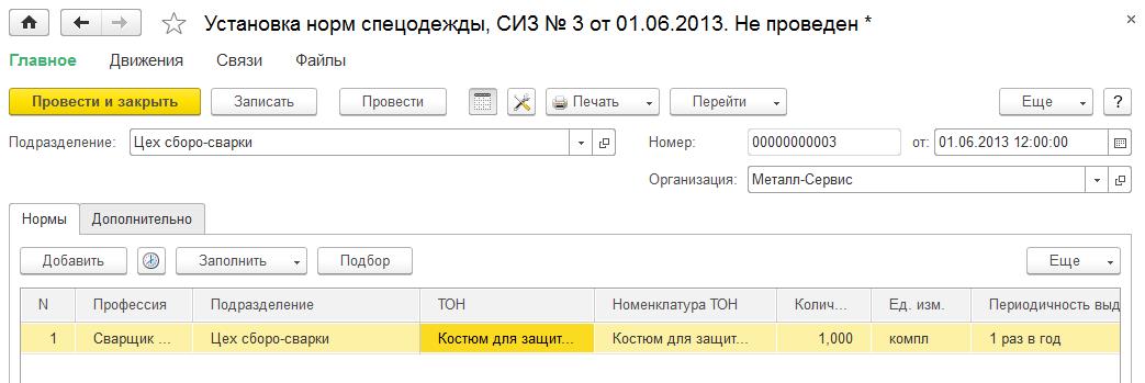 1. На первом этапе необходимо заполнить документ «Установка норм спецодежды, СИЗ», который помогает нам зарегистрировать факт установки норм выдачи спецодежды, СИЗ. В программе предусмотрена возможность установки норм на подразделения, на профессии, на отдельные рабочие места, на конкретных сотрудников, на вредные факторы и на вредные вещества. При выборе профессии и пункта ТОН программа сама проставит периодичность и необходимое кол-во для выдачи, а также укажет срок носки и состояние «Назначить».