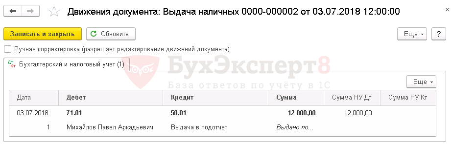 - Дт 71 «Сотрудник» Кт 50 — 32 000 руб.