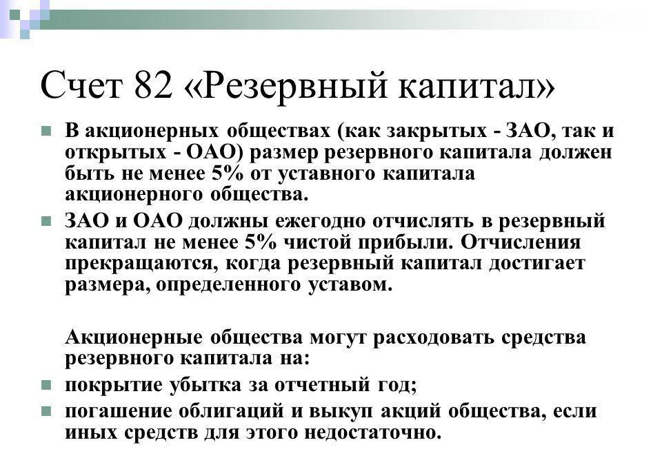 Учет резервного капитала (далее — РК) ведется при помощи счета 82, предназначенного для сбора всех сведений о состоянии и движении данного вида капитала.