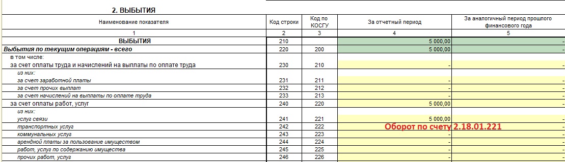 Отчет формируется в разрезе кодов КОСГУ, с группировкой по всем видам деятельности учреждения: целевые средства учреждения (КФО 5), субсидии на капитальные вложения (КФО 6), средства на выполнение государственного задания (КФО 4), средства от приносящей доход деятельности (КФО 2), средства ОМС (КФО 7). В случае, если показатель отчета рассчитан в отрицательном значении, следует его представить со знаком «минус».
