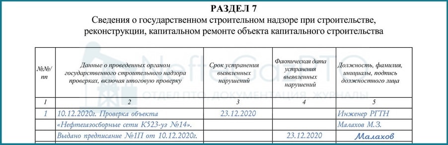 Данный раздел также является обязательным к заполнению, так как заказчик или застройщик обязан проводить строительный контроль. В ходе проверок, все замечания фиксируются в данный раздел с установлением срока устранения выявленных недостатков. При отсутствии недостатков, делается запись о проведенном контроле (сведения, дата контроля, «недостатки отсутствуют»). В случае игнорирования раздела №4 на организацию, проводящую строительные работы, может быть наложен штраф. Даже если все устные замечания были устранены.