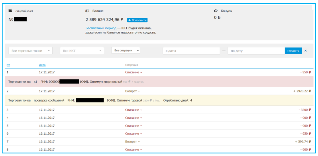 действия с лицевым счетом – просмотр информации о текущем состоянии и последних совершенных операциях, пополнение баланса, изменение персональных данных.