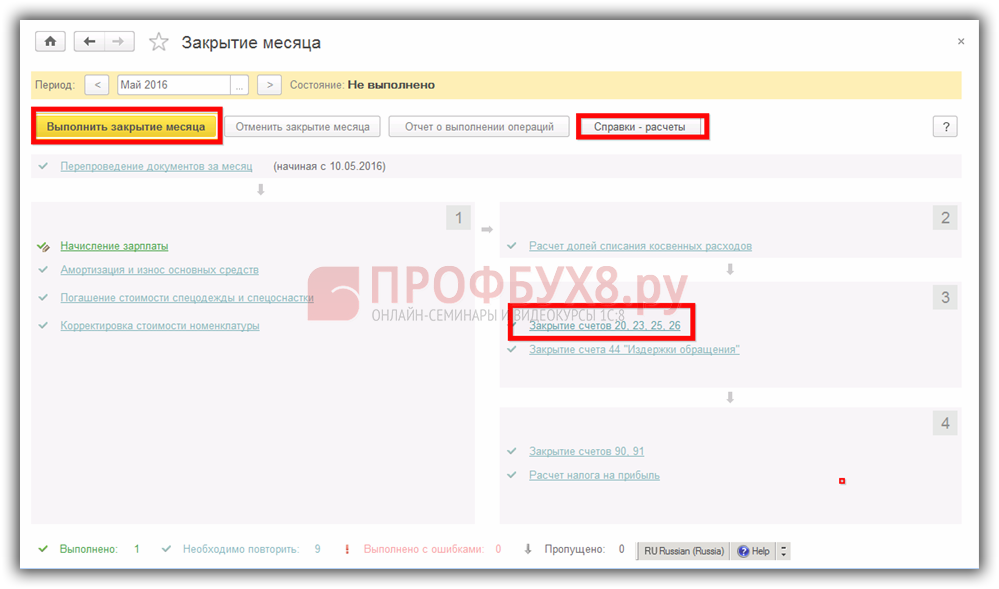 Чтобы понять, как в 1С 8.3 Бухгалтерия 3.0 происходит накопление сумм на остатке производственных счетов (20, 23, 29), нужно сначала разобраться, как они формируются. Для этого необходимо провести в базе 1С 8.3 ежемесячное закрытие счетов – 20; 23; 25; 26 через закладку Операции в главном меню: