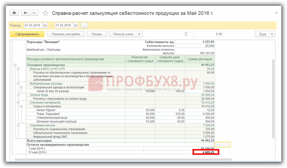 В нашем примере к расходам основного производства за май прибавляем сумму остатка НЗП на 01 мая и вычитаем сумму остатка НЗП на 31 мая – получаем фактическую стоимость выпущенной продукции: